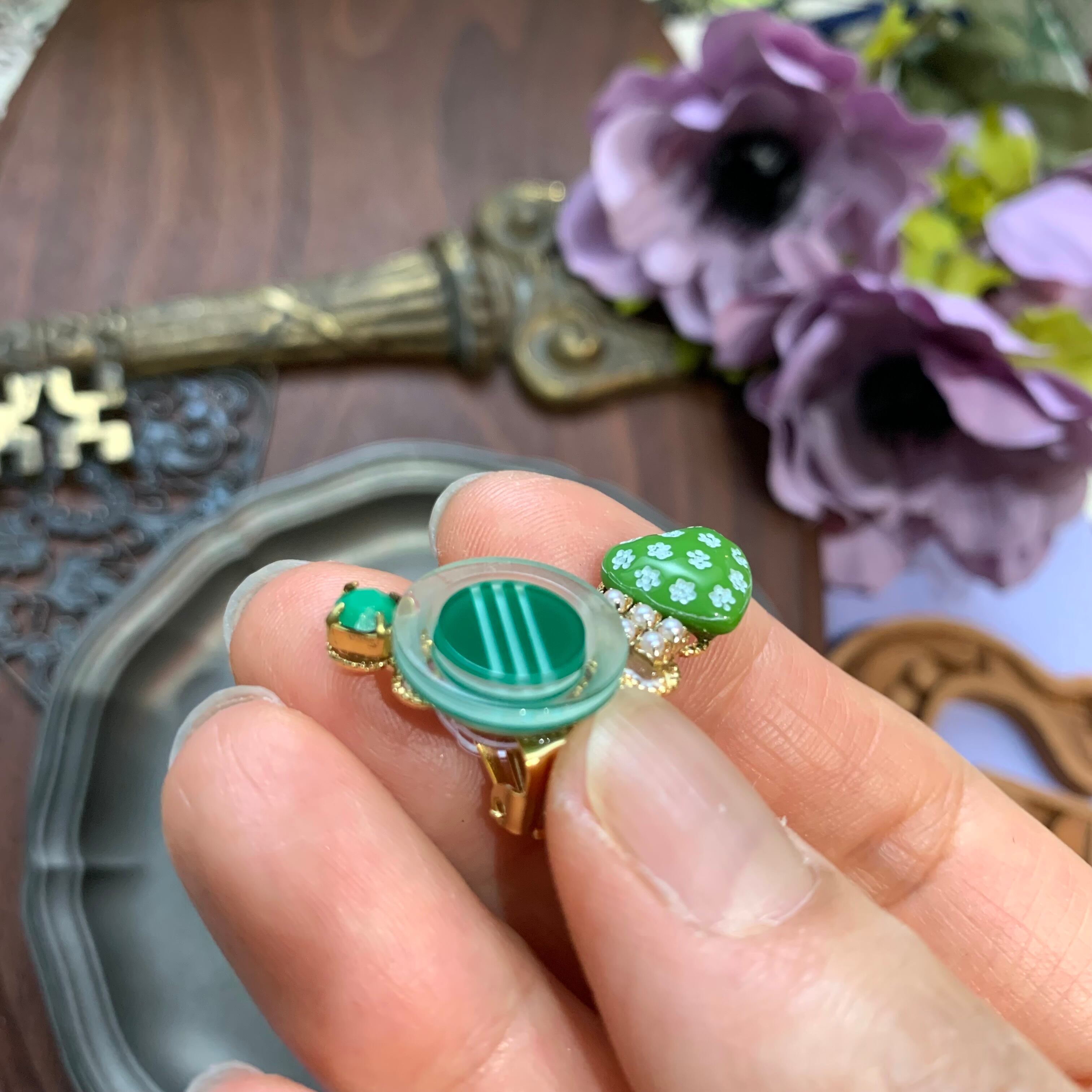 新緑のような明るいグリーンのパーツでまとめたイヤーカフ。