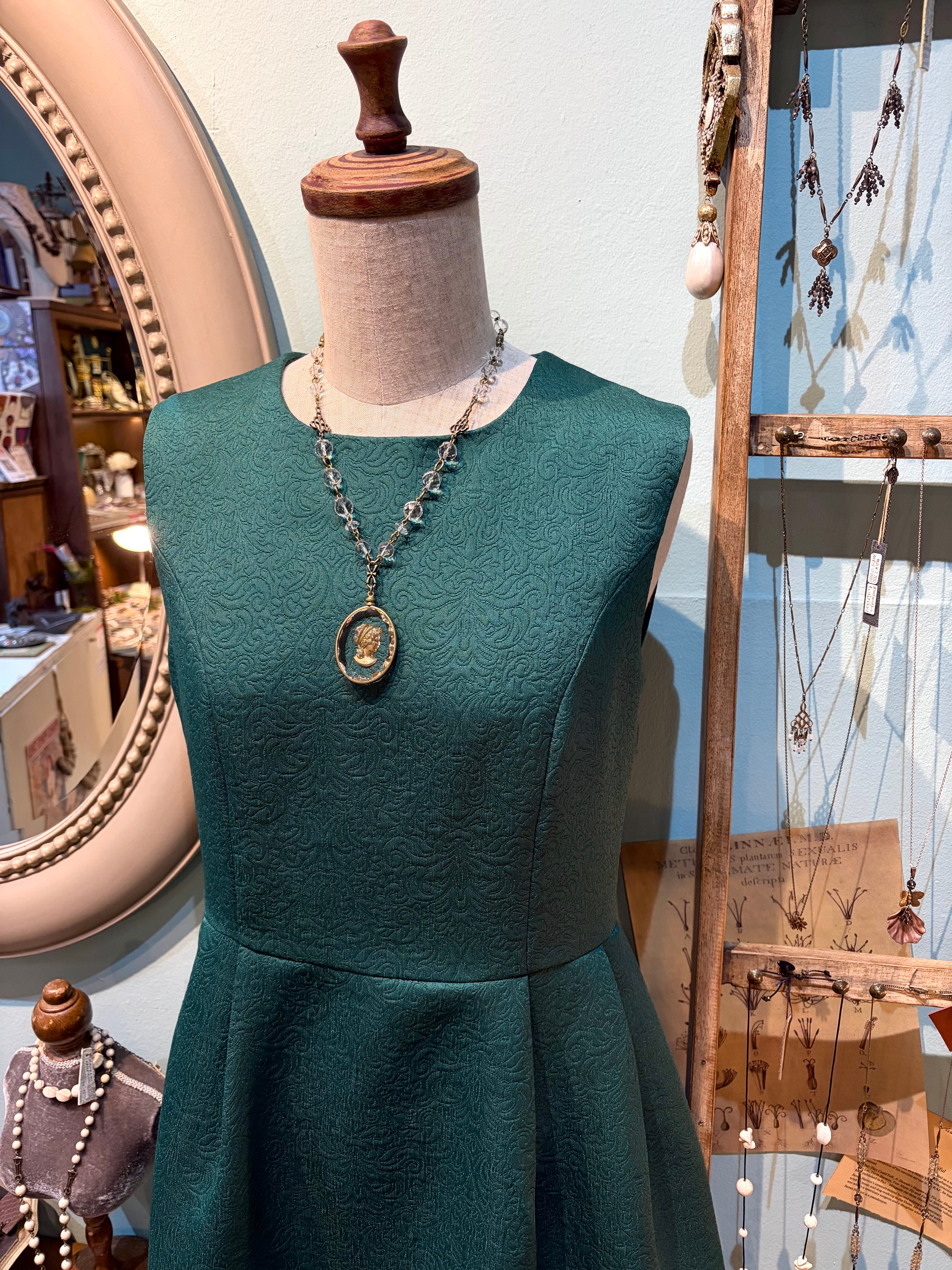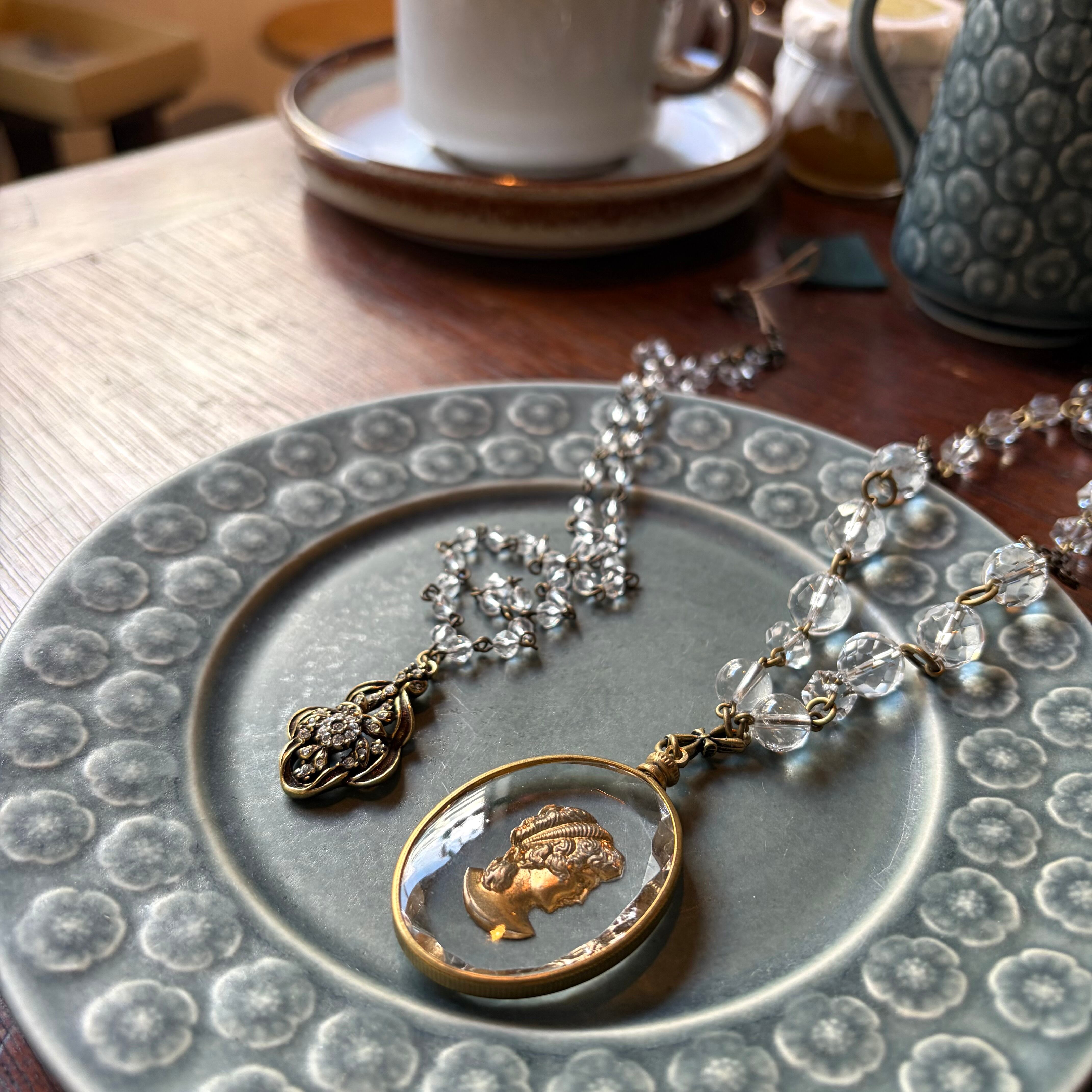 西ドイツヴィンテージの大きなトップ(裏から彫ってあるインタリオ)に、アジャスター飾りを含め5種類のカットの水晶を組み合わせた美しいネックレス。