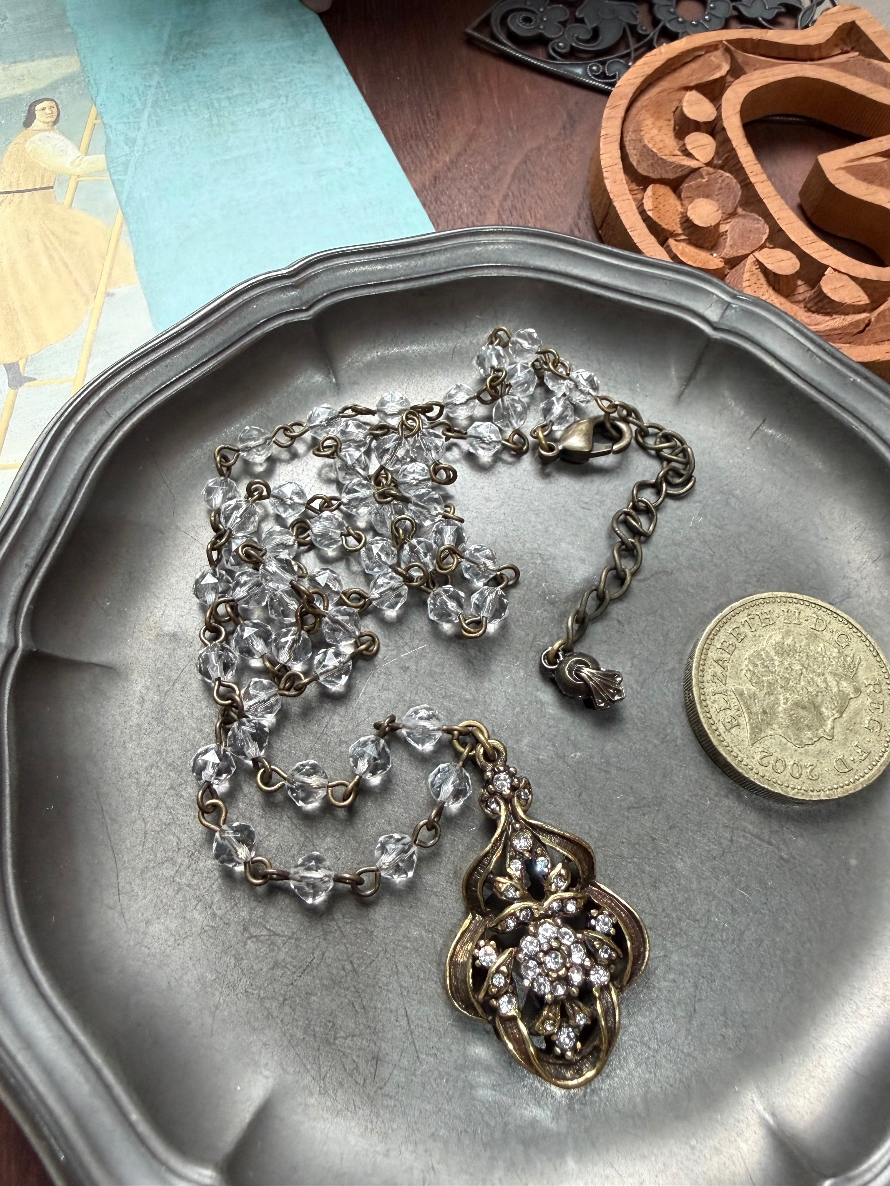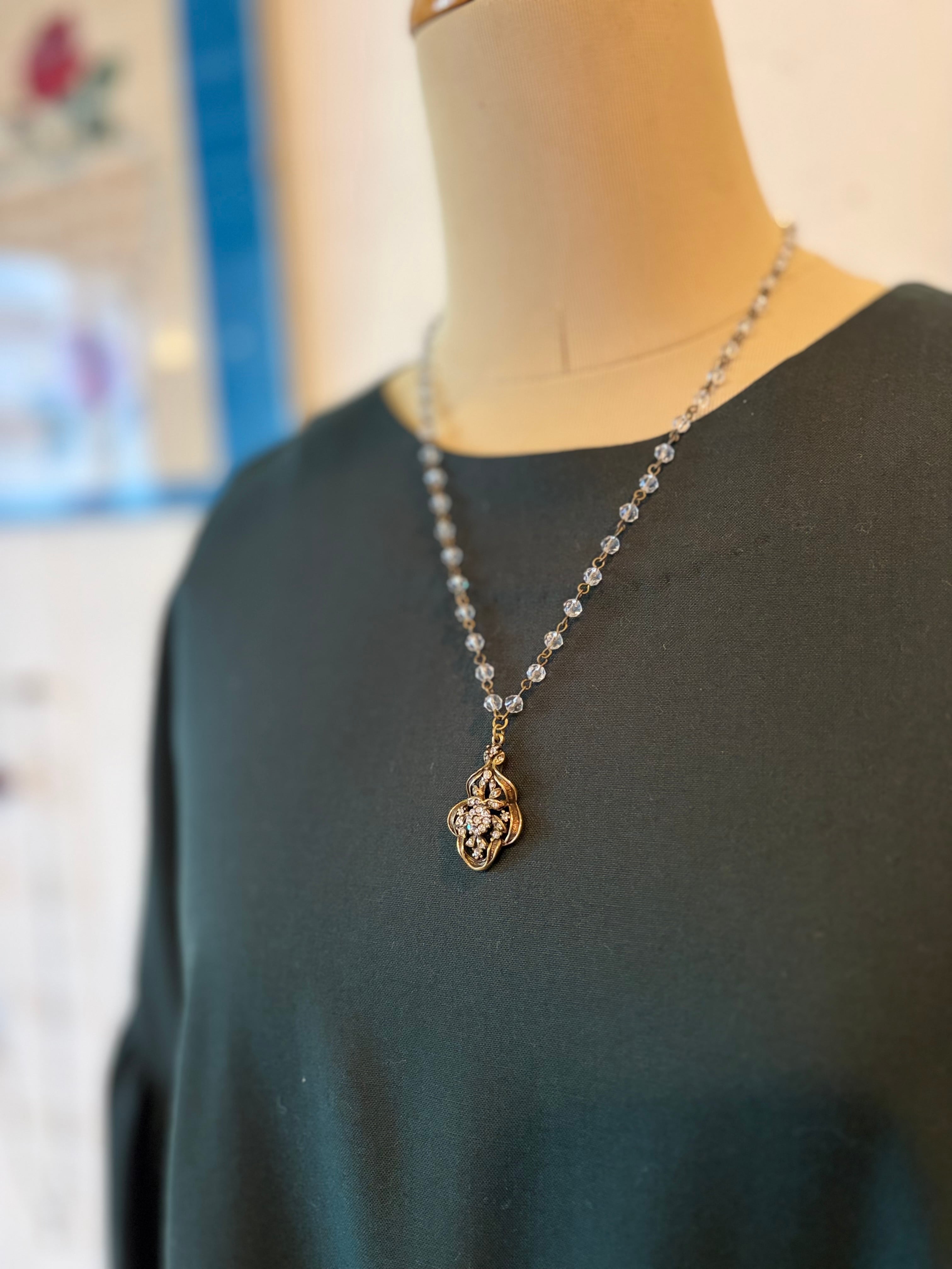 流れるリボンのようなモチーフのラインストーンパーツをメインに、シンプルな水晶のネックレスができました。