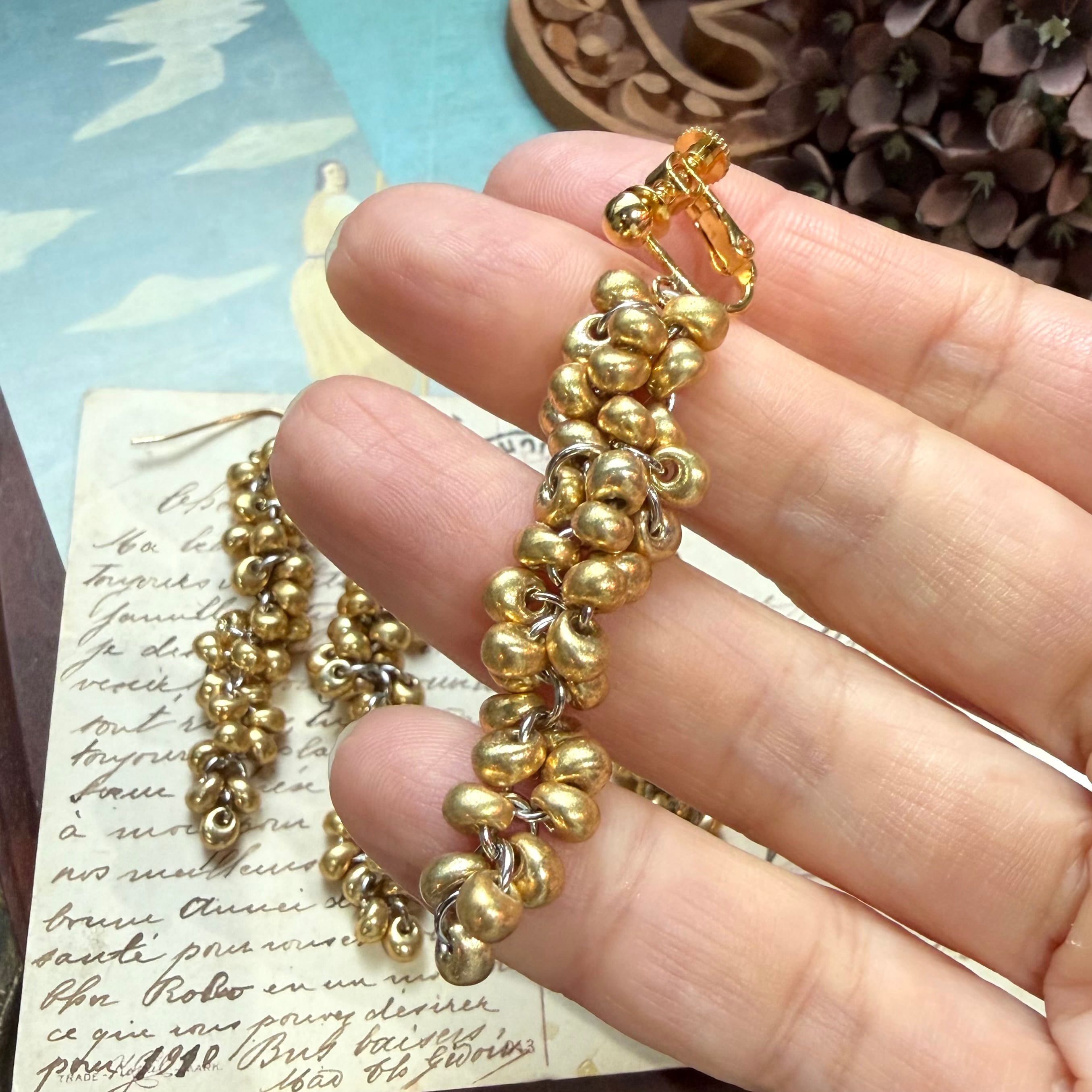 イエローゴールドの小さな粒をひとつずつカンで繋ぎ、形を作っています。