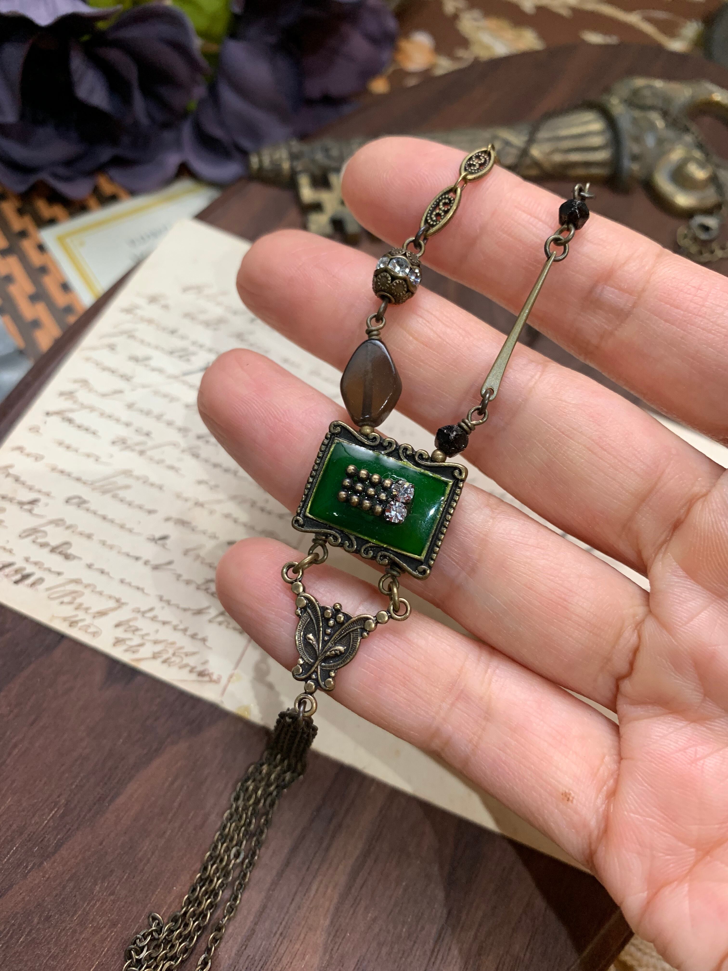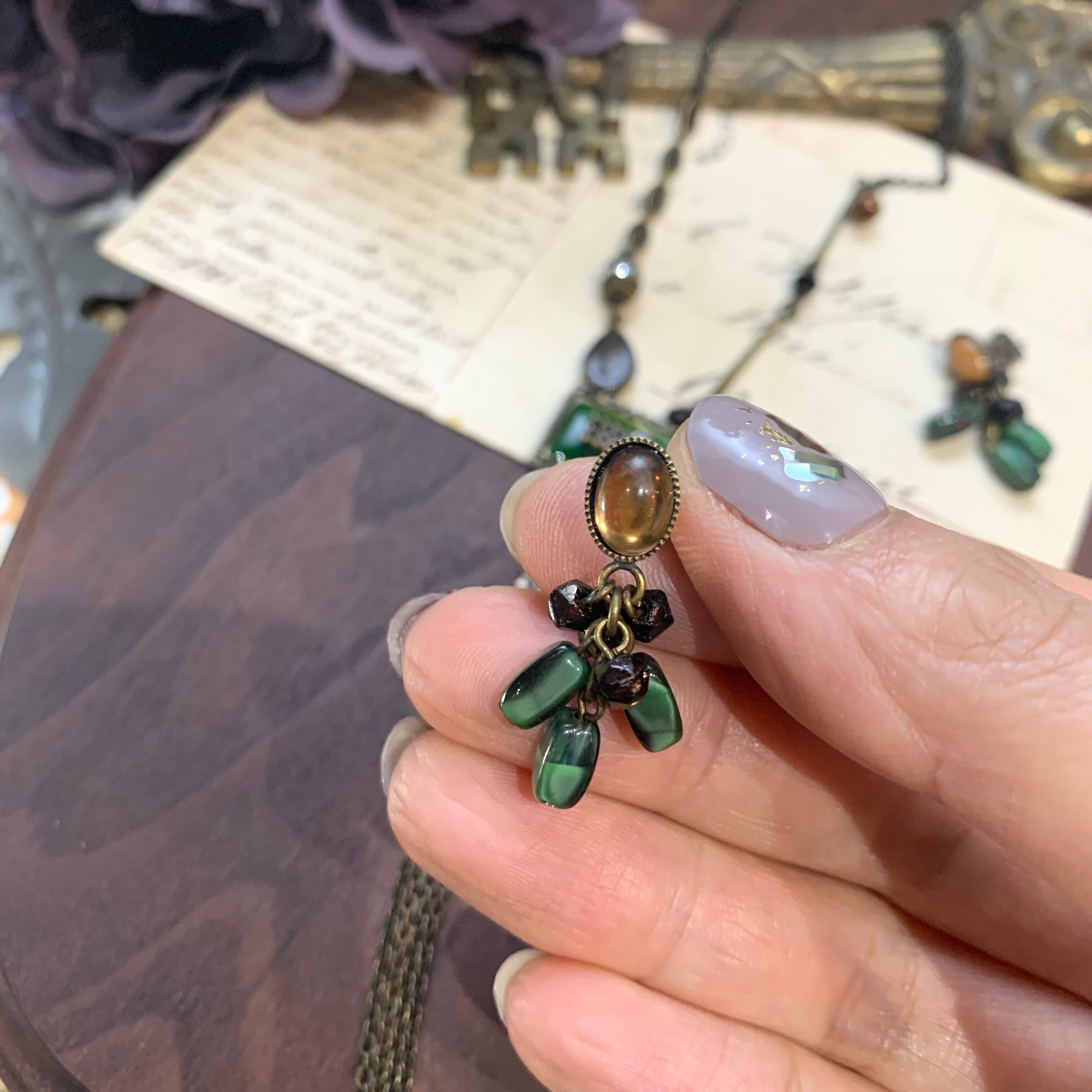 グリーンのパーツは中心にシェルのカケラが埋め込まれていてるもので、個体差があり、そのシェルが見えるものと見えないものがあります(チェーンとラインストーンは後から接着しているため)。