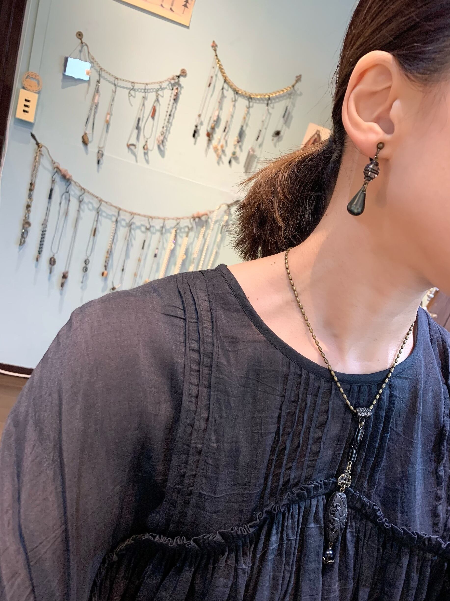 黒いビーズとメタルパーツのみの、渋いネックレス。