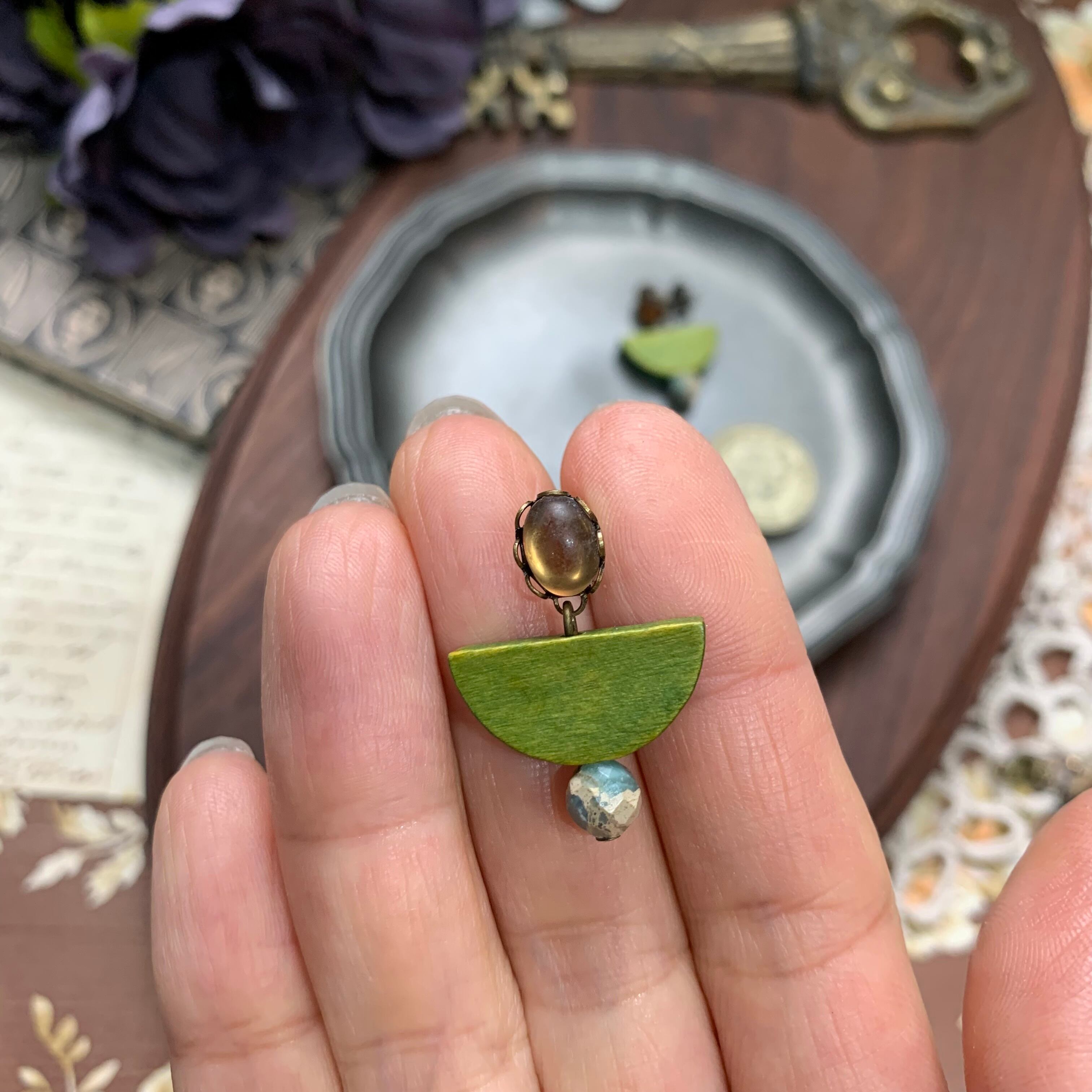 淡いブラウンの小さなカボションと、ウッドビーズがバランスよくまとまったカジュアルなデザインです。