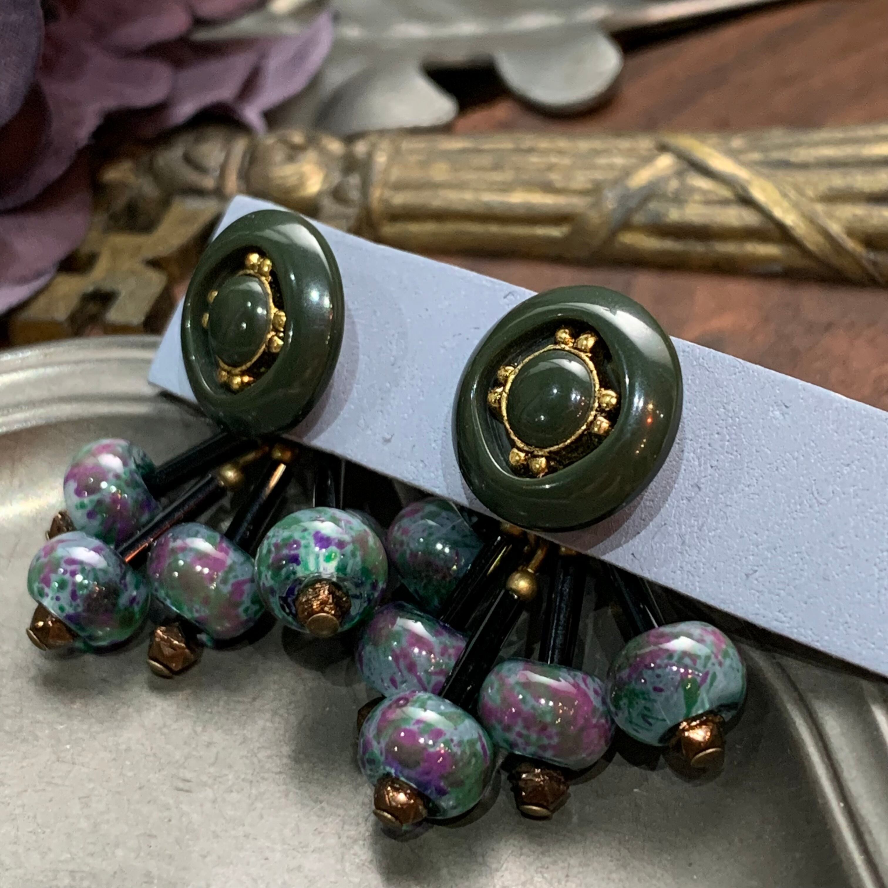 パープルとグリーンが混ざった穴の大きなビーズを、黒い竹ビーズに通してじゃらじゃらとさせた、個人的にかなり気に入っているデザインです。