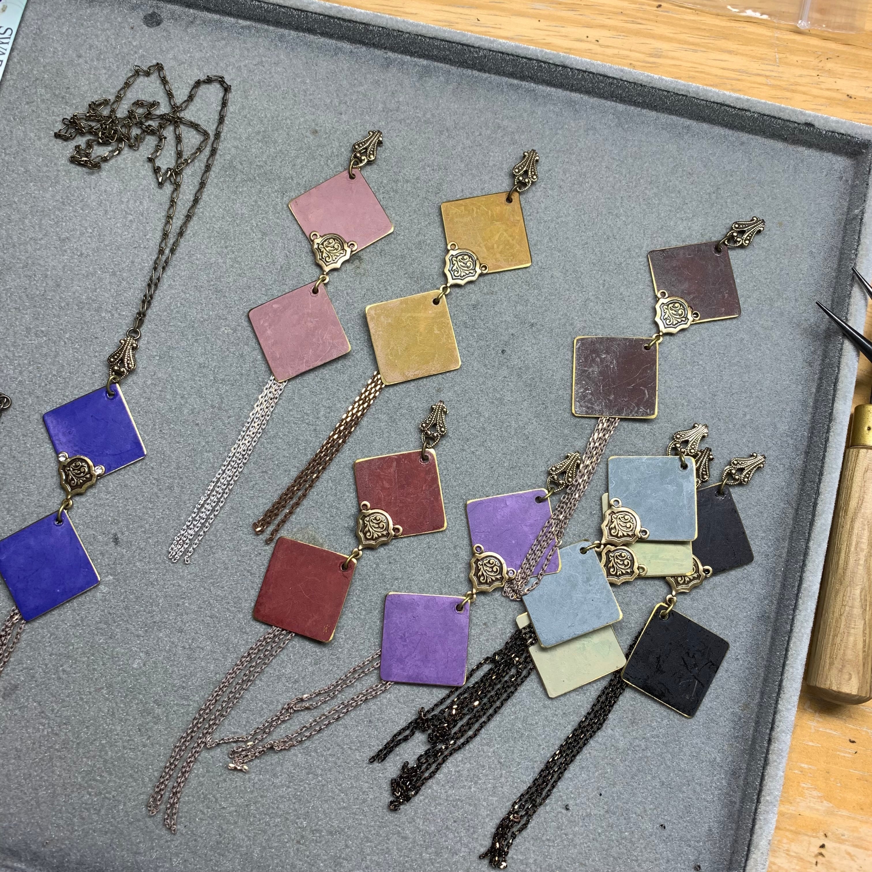 スクエアプレートの色に合わせて、下げたチェーンは4色使っています。
